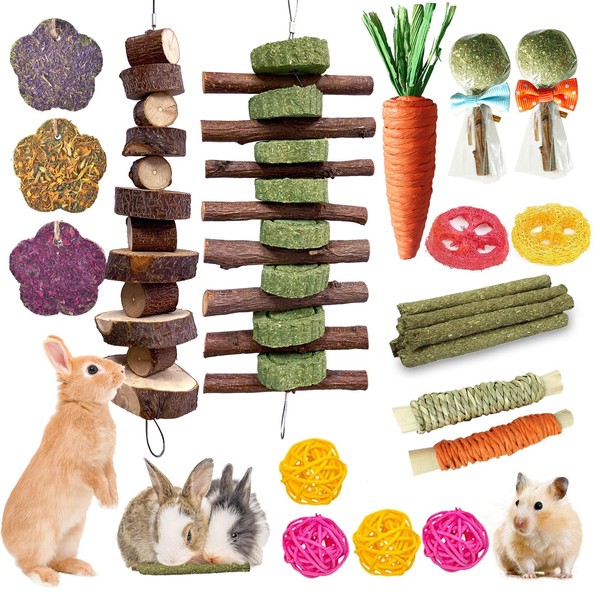 - MULTIPLE CHEW TOYS -- Set includes 1x apple wood molar string,1x timothy cake string,2x loofah toys,3x Large timothy grass cake with flowers,1X rabbit Carrot, 2x Sweet bamboo grass rope,5x grass sticks,2x Lollipop grass ball,4x rattan balls