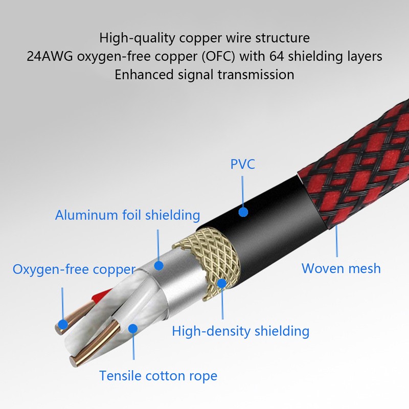 1、24AWG oxygen‑free copper, with multi‑layer shielding, provides high‑fidelity sound quality, maximum conductivity and signal clarity. 2、Using heavy‑duty structure, eliminate signal loss and reduce noise, improve signal transmission. 3、Ensure signal clarity and sound waves integrity, and minimize long‑distance signal loss. 4、The woven cotton mesh is added to the outer layer of PVC, which is durable and prevents scratches and abrasion. 5、It's very flexible, won't get tangled, and it's easy to wrap around after use to keep it organized.