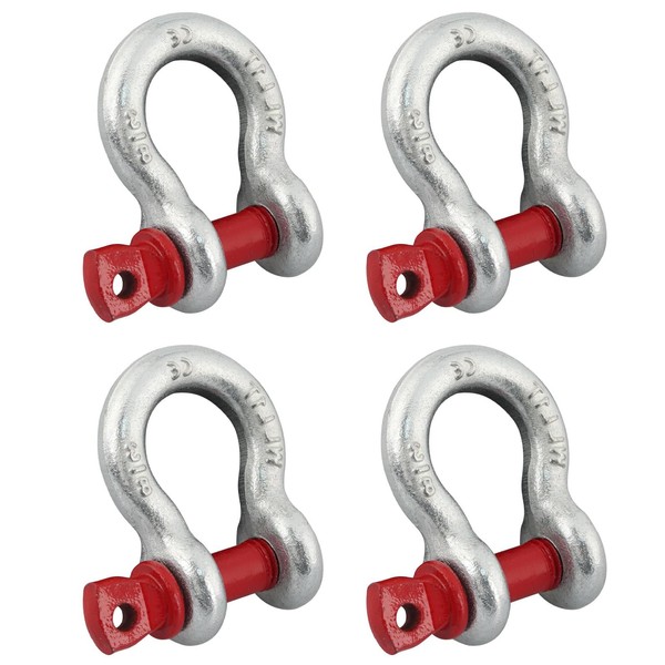 Jortmrd Pack of 4 1/2 inch shackles, 2.0 t high-strength U-shackle curved with threaded bolts, hot-dip galvanised steel, for camping, climbing, transport, pulleys and load lifting (4 pieces, WLL: 2.0t