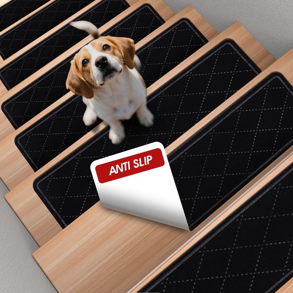 Jorviz 15-Pack Non-Slip Carpet Stair Treads for Wooden Steps Indoor, 8" X 30" Reusable Adhesive Backing Stair Runner Rugs for Kids Elders Pet, Diamond Pattern, Black