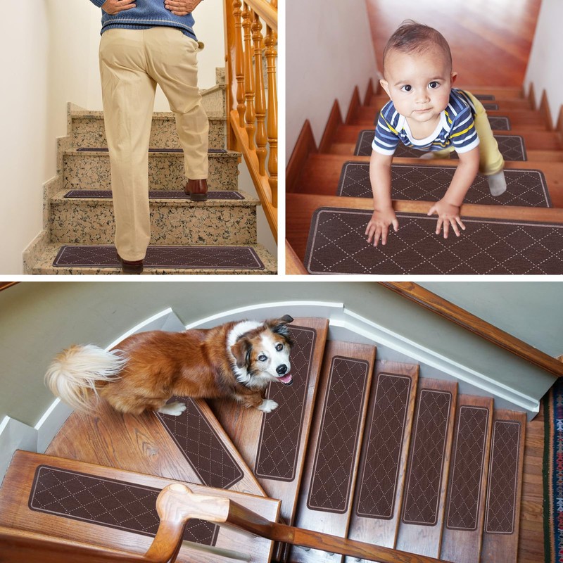 Imagine this: Your kids sprint upstairs with giggles, your pup dashes after them, and your elderly parents navigate the steps—all without a single slip. That's the peace of mind our non-slip stair treads for wooden steps deliver! Crafted with adhesive backing, each 8"x30" carpet stair treads non slip grips to wood, tile, or marble stairs.Ideal for families, pet owners, or anyone craving a slip-proof home. 15 pieces fit most indoor staircases. You’ll love how easy they are: Just peel, stick, and press! Trim them effortlessly for different sized steps, and toss'em in the washer when muddy paws strike—they’ll stay grippy after washes. Soft underfoot and silent? Yes! The premium polyester surface cushions every step, muffling creaks and clatters. Worried about residue? Don't be. Yank them up anytime—no sticky marks left behind.