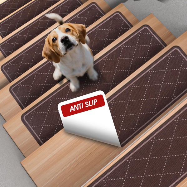 Jorviz 15-Pack Non-Slip Carpet Stair Treads for Wooden Steps Indoor, 8" X 30" Reusable Adhesive Backing Stair Runner Rugs for Kids Elders Pet, Diamond Pattern, Brown