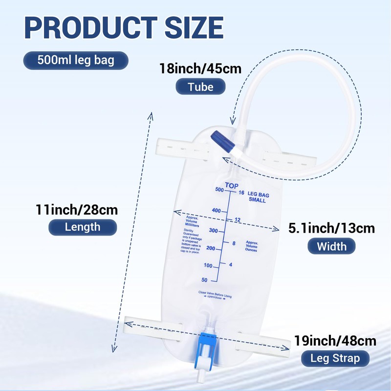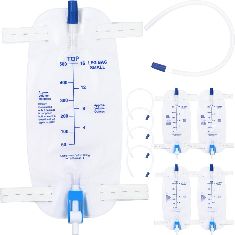 - 500ml Capacity and 5-Pack SetEach set includes five 500ml leg bags, providing ample supply for extended use. The compact design allows for easy carrying and use throughout the day.