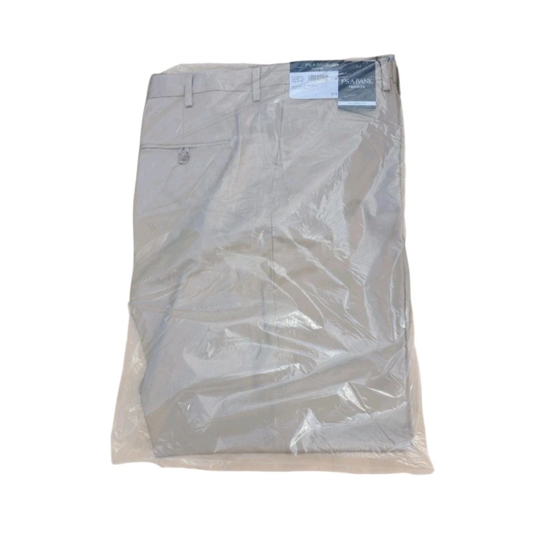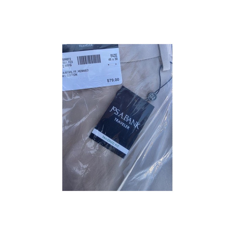 These are Joseph A. Bank men's khaki pants in size 46 x 30 with a tailored fit. They are made of twill fabric in a tan color, suitable for travel, casual, workwear, or business occasions. The pants feature a flat front, straight leg style, and slash pockets. They are machine washable and have a zip closure. The pants are new with tags and are designed for a comfortable and stylish wear.