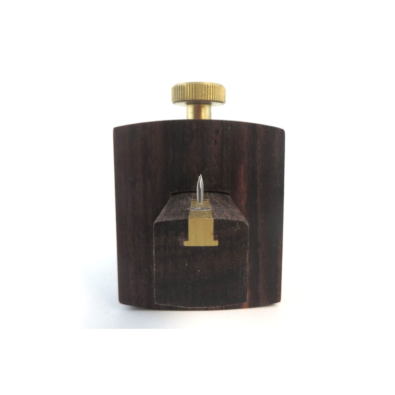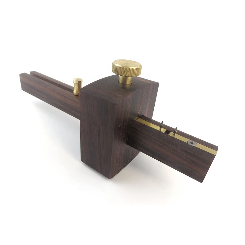 • This Marking Gauge combines two functions; one side is for laying out mortises by means of two pins, with one fixed pin and one adjustable pin via a brass pull-slide.