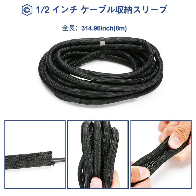 JOTO ケーブル収納スリーブ 長さ約8M 直径1.3cm DIY切断可能 PET素材、家庭用/オフィス用 -ブラック