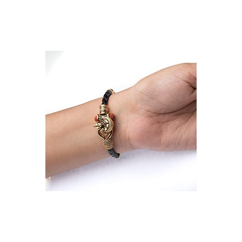 - MATERIAL: Faux Leather; Brass hook clasp; SHIVA BRACELET FOR MEN: This kada for men has a beautiful carving of Lord shiva (Bholenath), Om and damru along with a Rudraksha bead that gives it an authentic religious look.