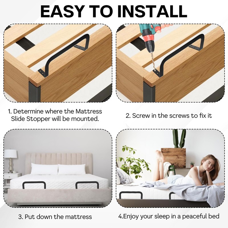 - AVOID SLIPPING:mattress slide stopper can firmly fix the mattress and avoid sliding. Bringing you a restful sleep, mattress retainer bar is a key accessory to enhance the function and safety of your bed, easily solving the problem of mattress movement, making your sleep more comfortable and peaceful