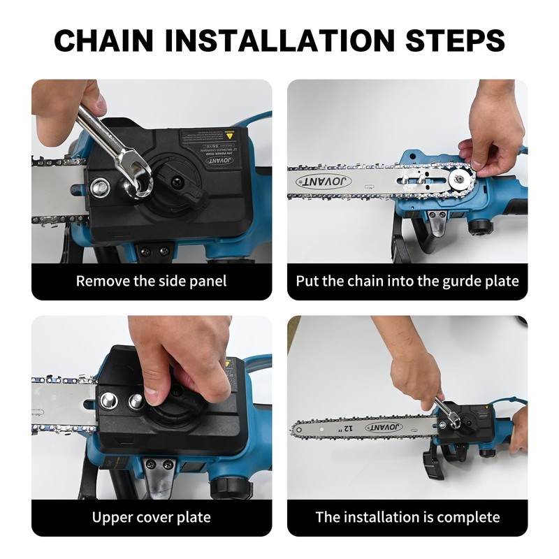 - Easy to replace:Replace the original chain and guide rod with JOVANT, install the side cover and tighten the nut, then adjust the tightness of the chain. Please pay attention to the installation direction(please note that the chain is in the correct direction of the tool teeth, and the long and sharp blade points forward).