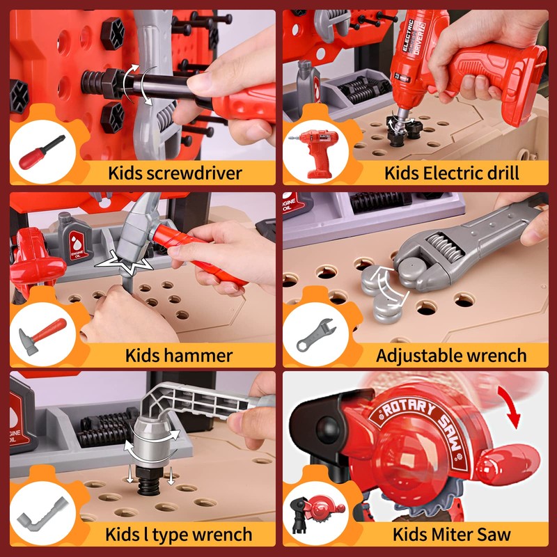 - 【Develop your child's skills】A variety of tool accessories can be used in combination or used individually,help develop kids'fine motor skills, and hand-eye coordination. The drill rotates safely and makes realistic drilling sounds that are great fun. The toy workbench table top is perfect for pretend cutting or drilling and also allows for hanging and arranging tools. The large capacity storage box can develop good habits of storage for kids.