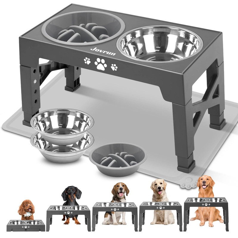 Jovrun Elevated Dog Bowls, Dog Feeder with 2 Stainless Steel Bowls &1 Slow Feeder Dog Bowls, 5 Heights Adjustable Raised Dog Bowls Stand for Medium Large Dogs, Dog Food Bowls with Non-Slip Feet