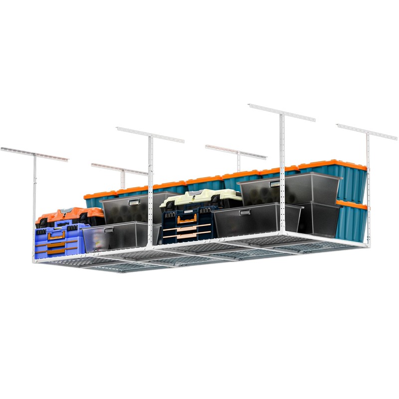 - EXTRA LARGE STORAGE SPACE: This garage hanging storage rack utilizes ceiling mounted storage for unused items and can hold up to 600 pounds.perfect for storing bikes,lockers,sporting goods,holiday decorations and other large bulky items.free your garage from clutter and let our garage racks take care of the storage solution for you.