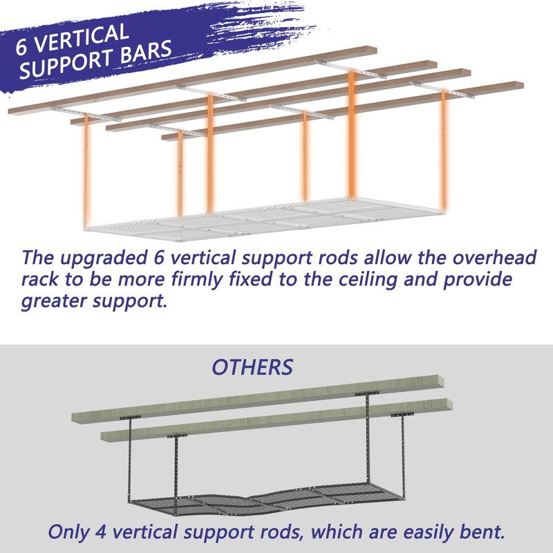 - DIY INSTALLATION: When installing the garage ceiling storage racks,you can easily assemble it by referring to the step-by-step instructions first,and then freely adjust the direction and height according to the spatial characteristics of your house.this overhead storage rack is suitable for all ceiling beams with ≤ 24 inches spacing,if the beam spacing is > 24 inches,it is only suitable for 36 inches ceiling spacing.