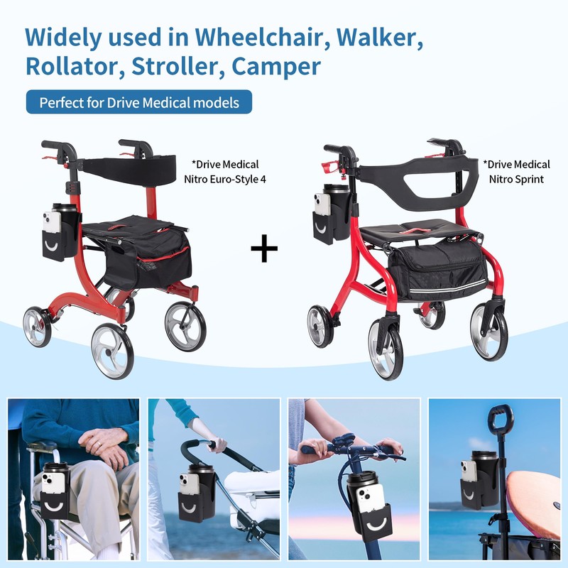 - Perfect Fit: Joxodak Walker Cup and Phone Holder is perfect for the Drive Medical Nitro Euro-Style 4 and Drive Medical Nitro Sprint models. Ideal for Wheelchair; Walker; Rollator; Stroller; Camper; Scooter