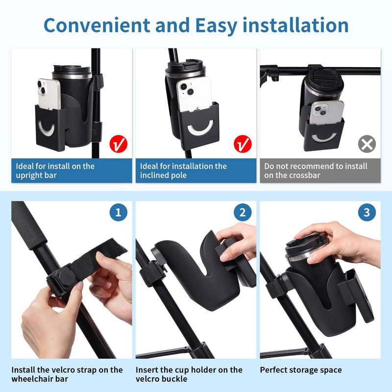 - 2 in 1 Walker Cup Holder: Joxodak Wheelchair Cup Holder can hold a water cup and a mobile phone at the same time. It can be installed on a wheelchair or walker to make it convenient to carry items. Perfect for wheelchair users, without any vibration or falling-off dangers