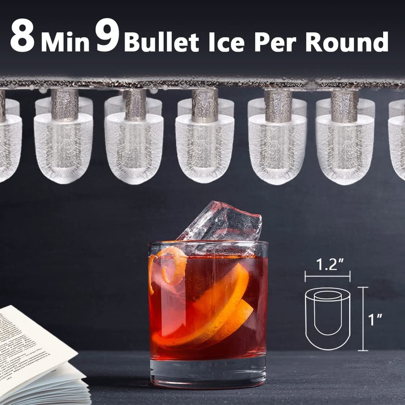 • High Efficient for freezing drinks TO-GO: Joy Pebble Ice Maker has higher ice efficiency than most ice maker on the market. This ice machine can produce 9 pcs bullet cubes in 8 min and 26lbs in 24hrs. IT is enough for your whole family parties.