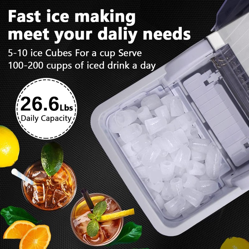 • Simple Used & Two-Step method:The countertop ice maker is simple to use, just by adding water and start it. The ice maker indicator will remind you to take out ice when the basket is full and to add water while lacking water.