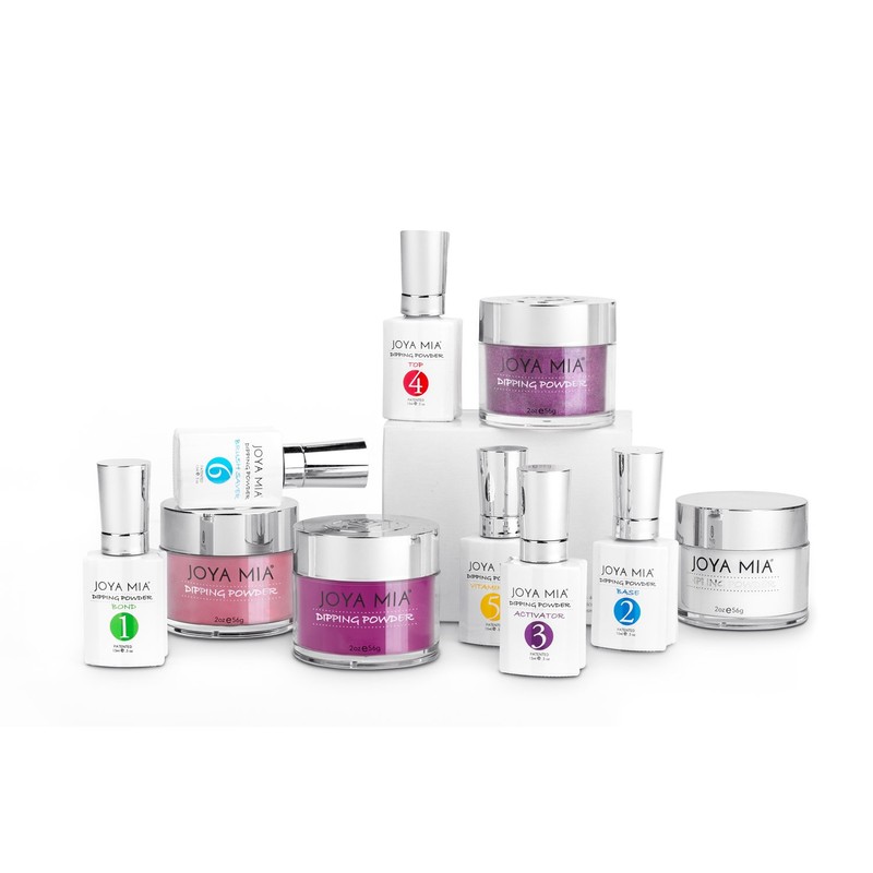 - EVERYTHING YOU NEED - This Complete Starter Kit is suitable for any nail enthusiast. We have included three vibrant dipping powder colors (Pink, Burgundy, Purple Glitter) and a full jar of Clear powder. In this kit, you will also be getting all six liquid bottles steps #1 - #6 (Bond, Base, Activator, Top, Vitamin Oil, Brush Saver). All you need to accomplish a freshly dipped manicure is in Joya Mia’s Complete Nail Dipping Powder Starter Kit.
