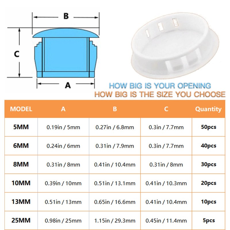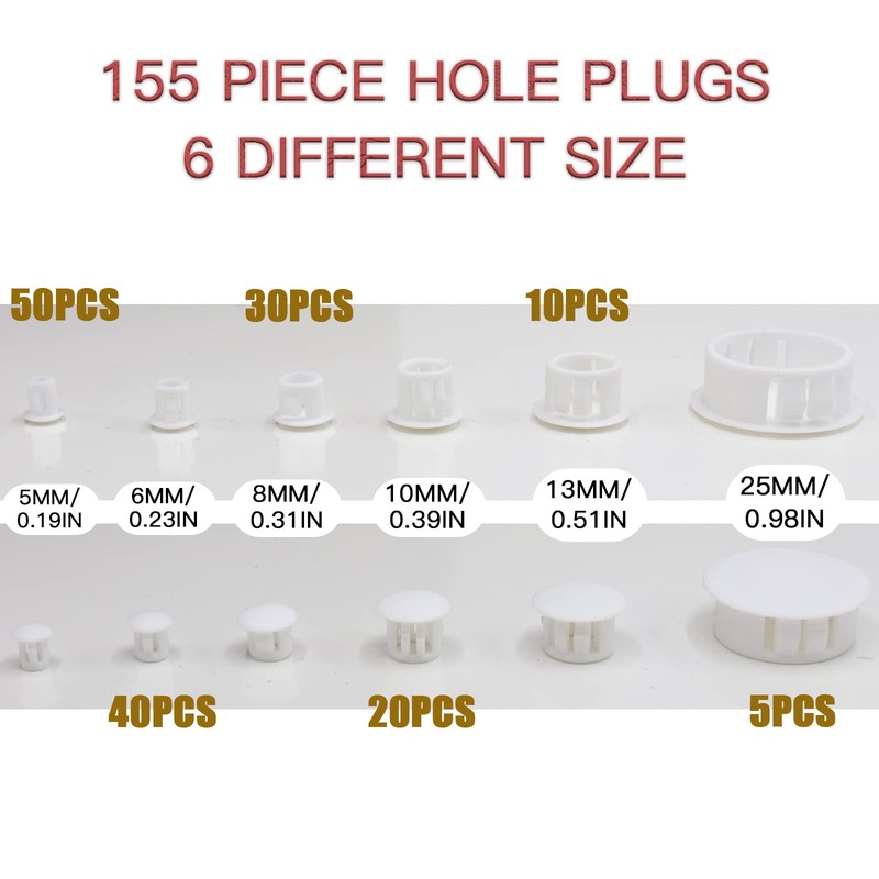 - What you will get: 155-piece set white plastic hole plugs includes six different sizes (50pcs 3/16", 40pcs 1/4", 30pcs 5/16", 20pcs 3/8", 10pcs 1/2", and 5pcs 1") to accommodate various hole diameters, door screw cover hole plug can make your furniture holes more beautiful.
