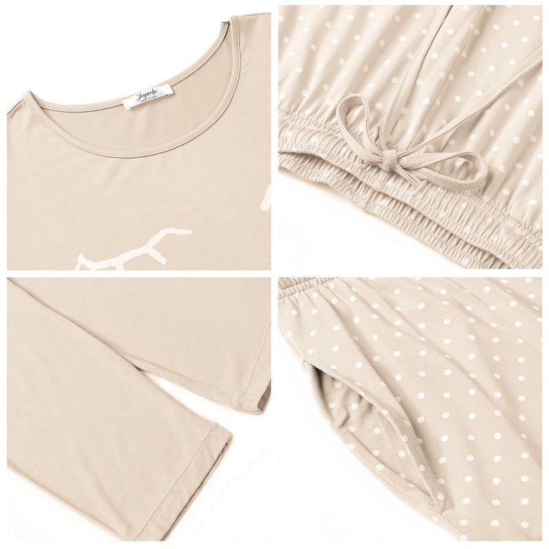 - [Lovely & Comfy Design]: The playful pajamas top with round collar and long sleeve makes you much more lovely. The adorable print "LET ME SLEEP" always lighten your mood. The long pajama pants with polka dot patterns are cute and stylish. The elastic waistband with adjustable drawstring for a relaxed fit that won't get in your way. Two side pockets are very convenient. Without irritating decoration, this PJ set is simple, elegant and comfy, suitable for women of all ages