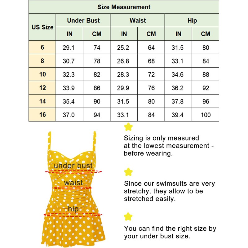 - Nuestros trajes de baño con falda de una pieza están disponibles de tamaño 6 a 16, 16 W a 24 W en colores sólidos clásicos y patrones impresos únicos. Recomendamos a los clientes que vayan con tu talla normal.