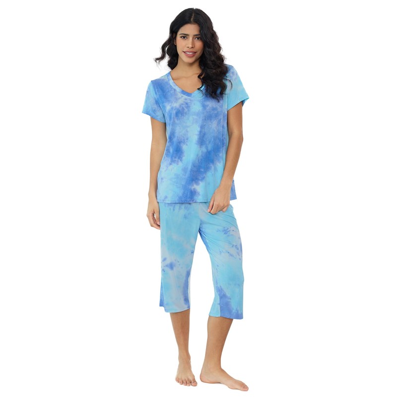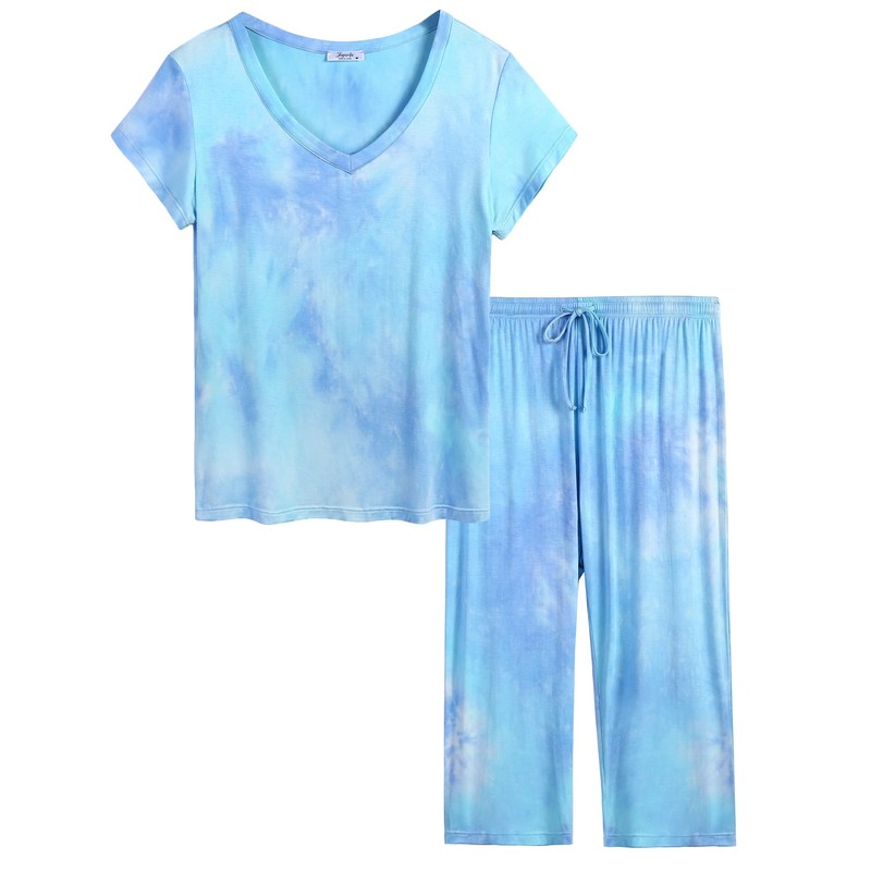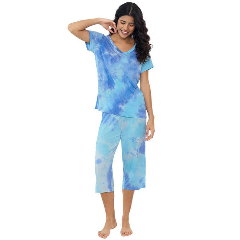Joyaria Womens Light/Lightweight Pajamas Short Sleeve V Neck Capri PJ Sets Ultra Soft Sleepwear (Tie Dye, Large)