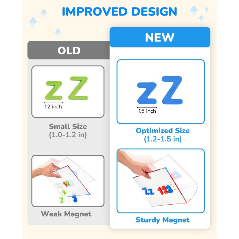 • Enhanced Features: Our magnetic alphabet letters and numbers have been enlarged to 1.2 inches to 1.5 inches in size with a more refined matte texture for improved grip for young children. Toddlers' small hands fit the larger size precisely. For long-term use, we also enhance the magnet to make it more durable and difficult to remove