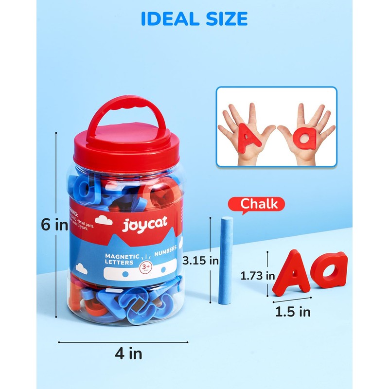 • What's Included in the Package: This JoyCat educational toy set includes 78 pieces of magnetic letters and numbers: 26 capital letters, 26 lowercase letters, 20 numbers, and 6 math symbols. The set comes in two sophisticated colors  red and blue  and is packaged in a portable plastic bucket. A fantastic toy for children, this fridge magnet set makes learning fun and engaging