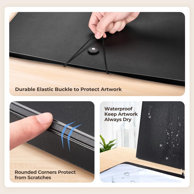 • Optimized Structural Design: This artwork folder features a unique layered structure where the bottom layer is higher than the top, facilitating easy access and retrieval of artworks. Additionally, its water and dust resistance protects the internal pieces from environmental impacts, preserving the integrity and longevity of the artworks