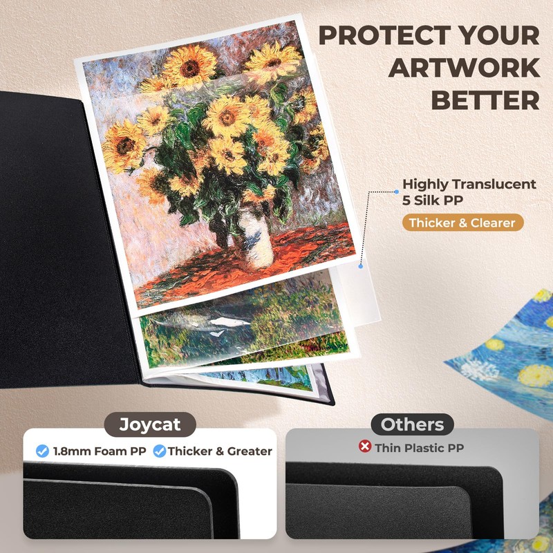 The JOYCAT portfolio binder is an 11*17 inch binder made from premium 1.8 mm thick foamed PP board. It is designed with a capacity of 40 pockets, allowing for the storage of 80 artworks on both sides, meeting the storage needs. The inner pages of the large capacity art portfolio are made of highly transparent PP Components with a single-layer thickness of 5 mils, ensuring a clear display of artistic works. The unique layered structure, with the lower layer higher than the upper layer, facilitates easy access and retrieval of artworks.The binder also features water and dust resistance, protecting the artworks from environmental influences and maintaining their integrity and longevity. The side is equipped with an elastic cord closure system, effectively preventing the contents from falling out during transportation and ensuring a secure closure even when the binder is fully loaded, safeguarding the artworks. Suitable for education, office, creative work, and photo storage, this product's versatility and portability make it an solution for storing fashion design portfolio. This artistic storage binder is not just a storage tool, but also provides a safe and convenient platform for displaying artworks.