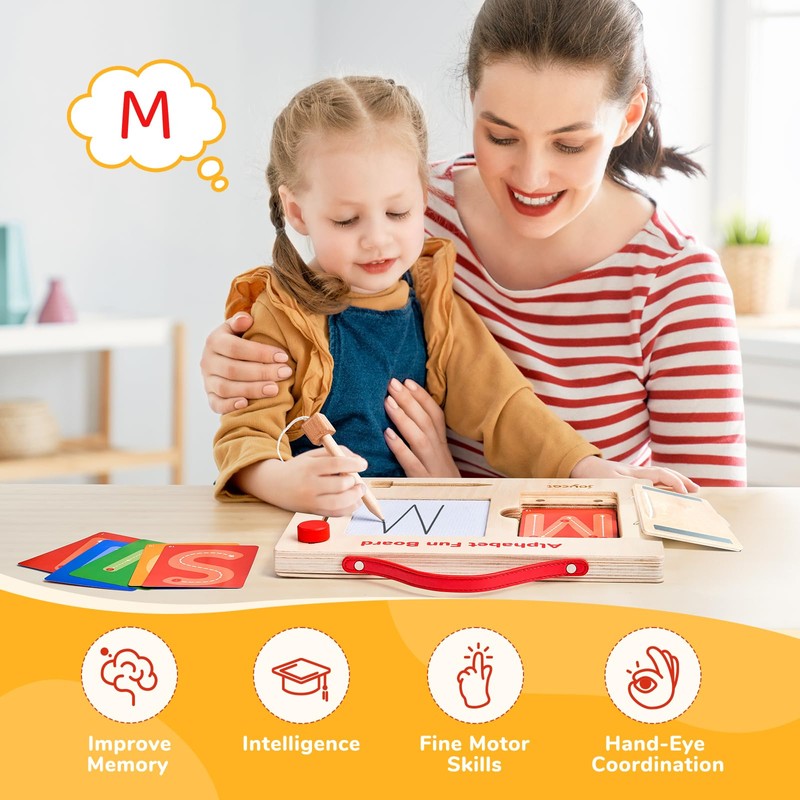 • Alphabet Tracing Board: Including a writing board, 26 alphabet cards and 10 number cards. It’s designed to improve fine motor skills, hand-eye coordination, and writing abilities without worrying about mistake
