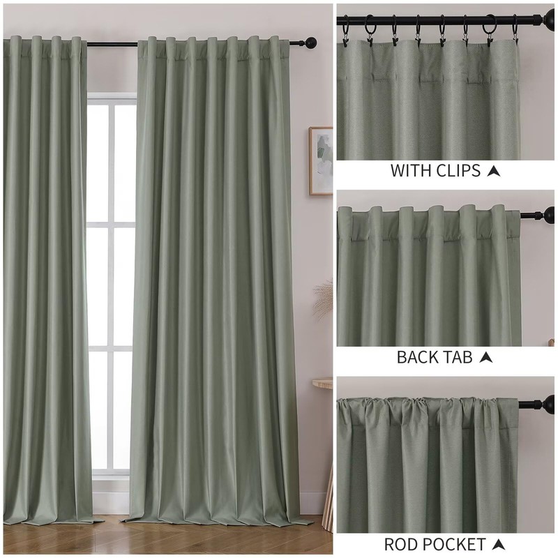 - Three Hanging Options - Back Tab, Rod pocket and Clips. 8 back loops per panel, and the top of the 3 "pole pocket is suitable for most standard poles, providing maximum coverage for every household window.