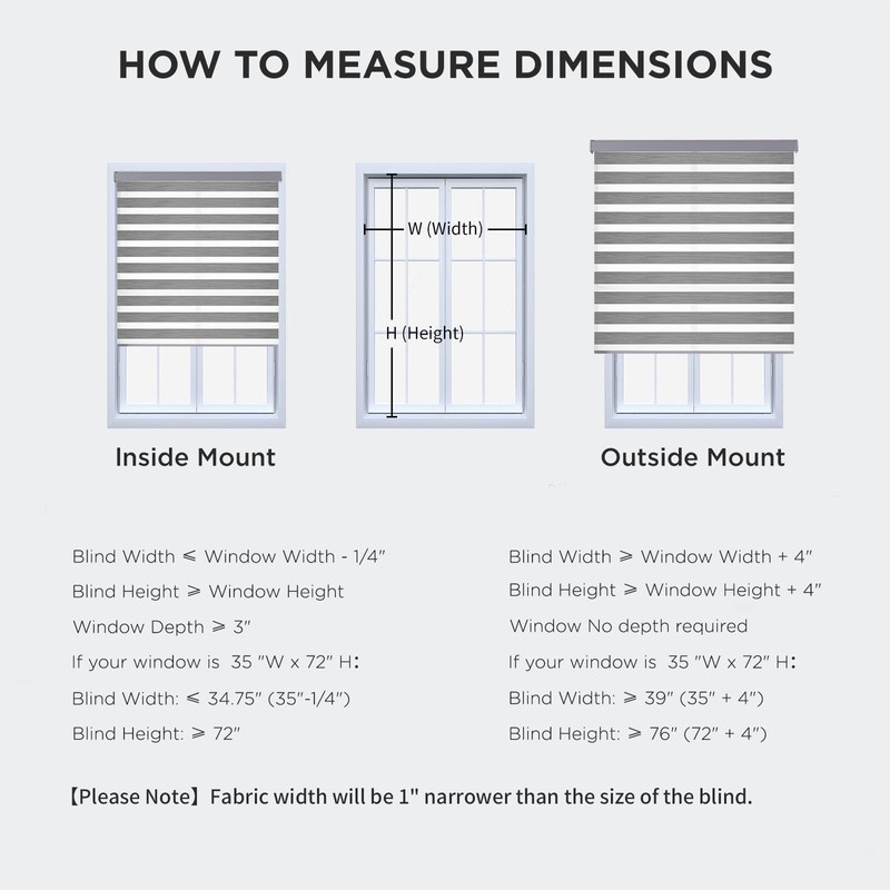 - 【How to choose a correct size】Example your window meas 35"W x 72"H:①INSIDE MOUNT: Window Width deduct 0.25" is Blind width. Blind Width≤35"-0.25=34.75"; Blind Height≥72". ②OUTSIDE MOUNT: Plus at least 4" is blind width, Blind Width≥35"+4"=39"; Blind Height≥72+4=76".【Plus Note】Fabric width will be 1" narrower than the size of the blind