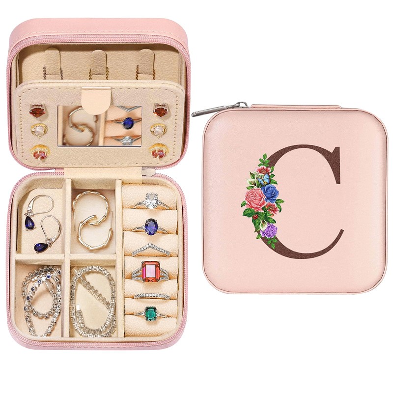 Joyero de viaje, mini joyero de viaje portátil con espejo, organizador de anillos de joyería, caja de regalo para mujeres y niñas, joyero portátil para pendientes, collares, anillos y pulseras (C)