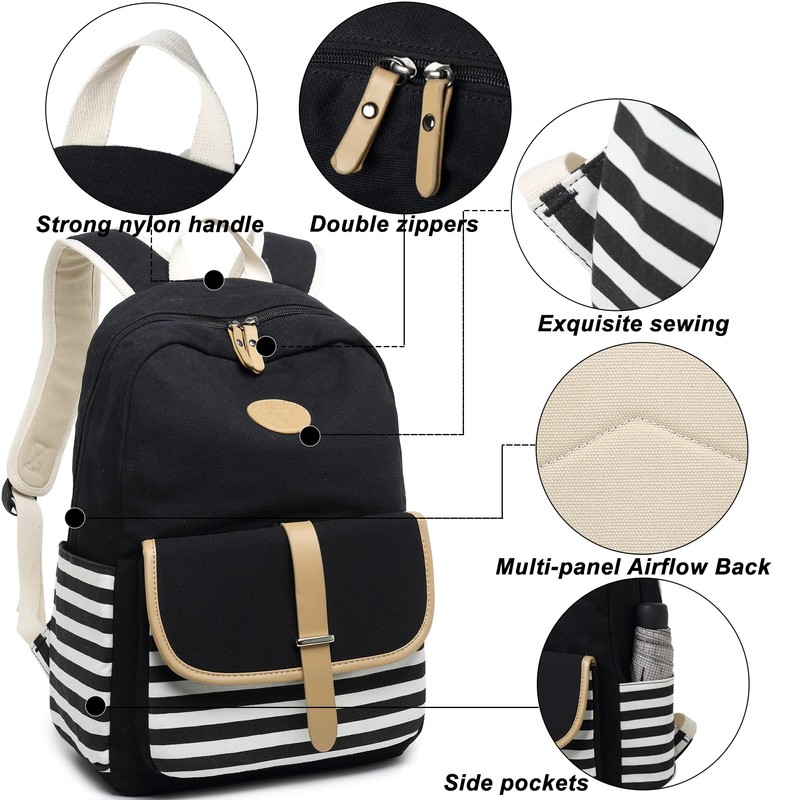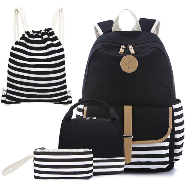 - School backpack set including teens backpack + lunch box + drawstring sack + pencil bag 4-in-1 school bookbags, which are made of durable canvas material and smooth zipper, and with vintage stripe printing design.