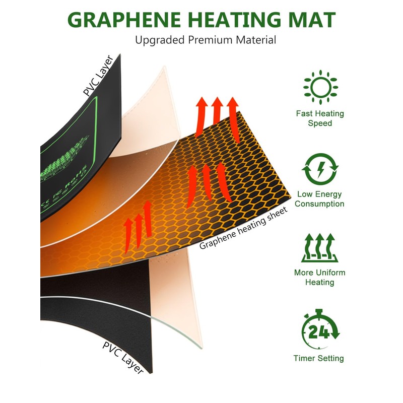 - Graphene Seed Heat Mat for Faster Germination: Compared to traditional electric heating mats, our graphene heat mat heats up faster and more evenly, with a built-in timer for convenience. It creates the ideal environment for indoor seed starting trays, greenhouse seed germination, and hydroponic plant propagation. Designed for indoor gardening, this waterproof and reusable heat mat accelerates growth and improves seedling survival rates.