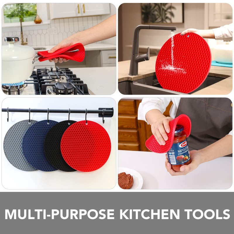 - MULTI-PURPOSE KITCHEN TOOLS - Each trivet has a corner hole for convenient hanging storage and can be used as a coaster, drying mat, jar opener gripper pad, spoon holder, garlic peeler, and potholder mat.