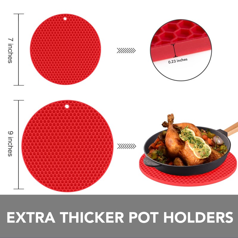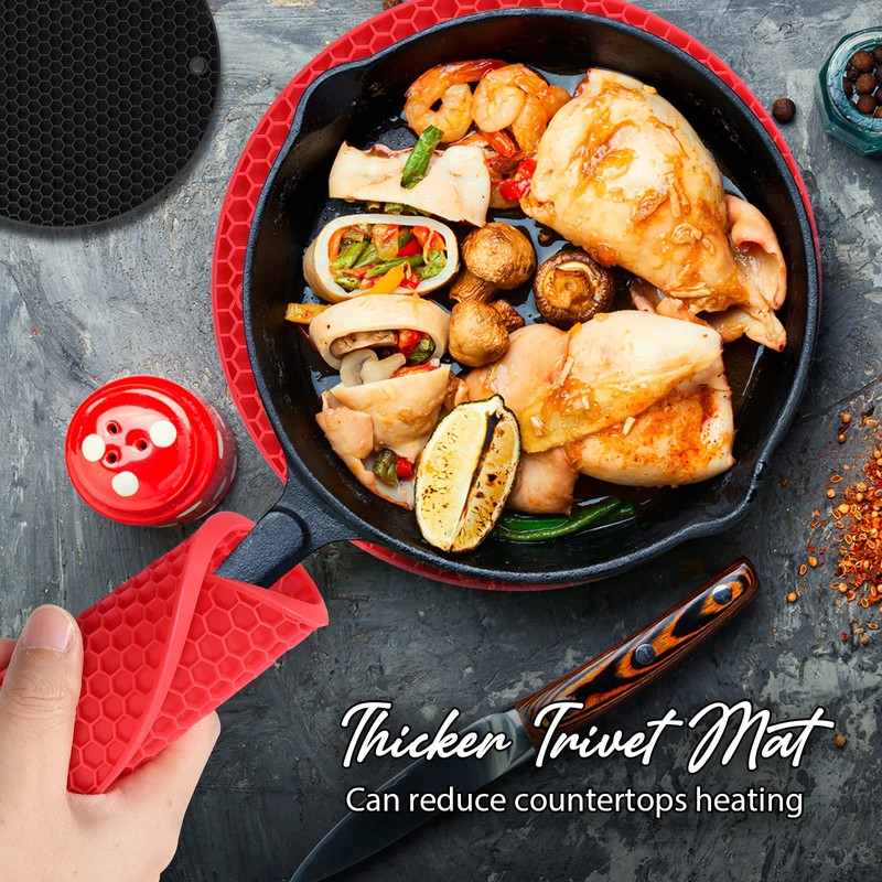 - FLEXIBLE & DURABLE TRIVETS - Our silicone trivet mats for kitchen counter are thicker than traditional sets to provide long-lasting durability and better protection for your countertops while maintaining their flexibility. The honeycomb pattern makes them more heat-resistant.