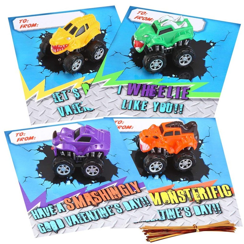 - REAL FUNCTION. The monster trucks included are pull-back-n-go which is very easy to operate, easy to assemble with foil ties and no glue required. The gift card also has special punchlines in its greetings which adds more fun to it. Your kids will surely enjoy playing with it while spreading their love during Valentines day!