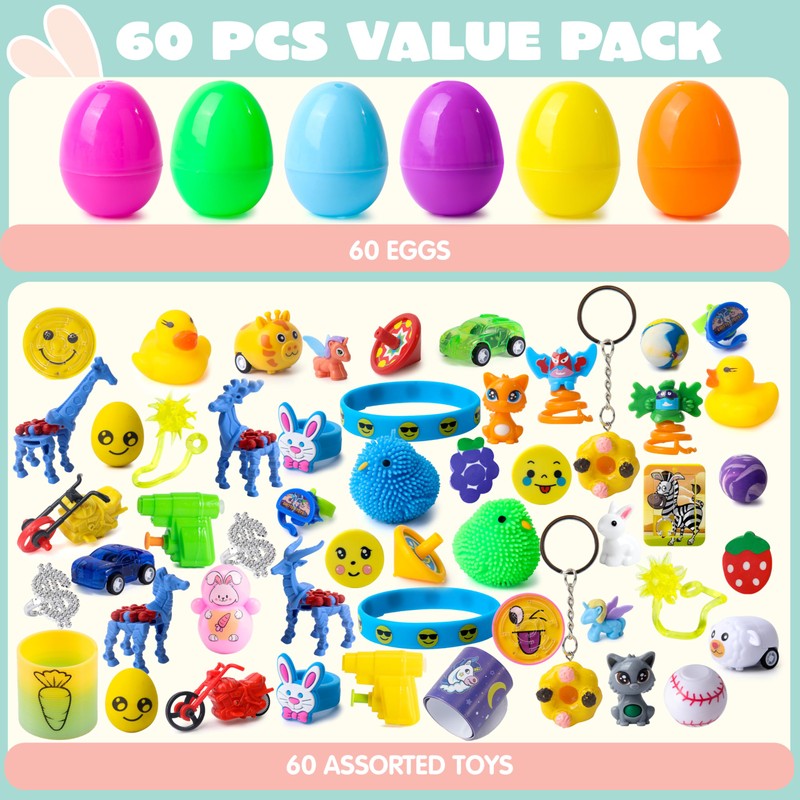 - VALUABLE SET. Our Easter egg pack has 60 bright color egg pieces filled with mini novelty toys and stickers. Each egg measures 2 3/8 inches.