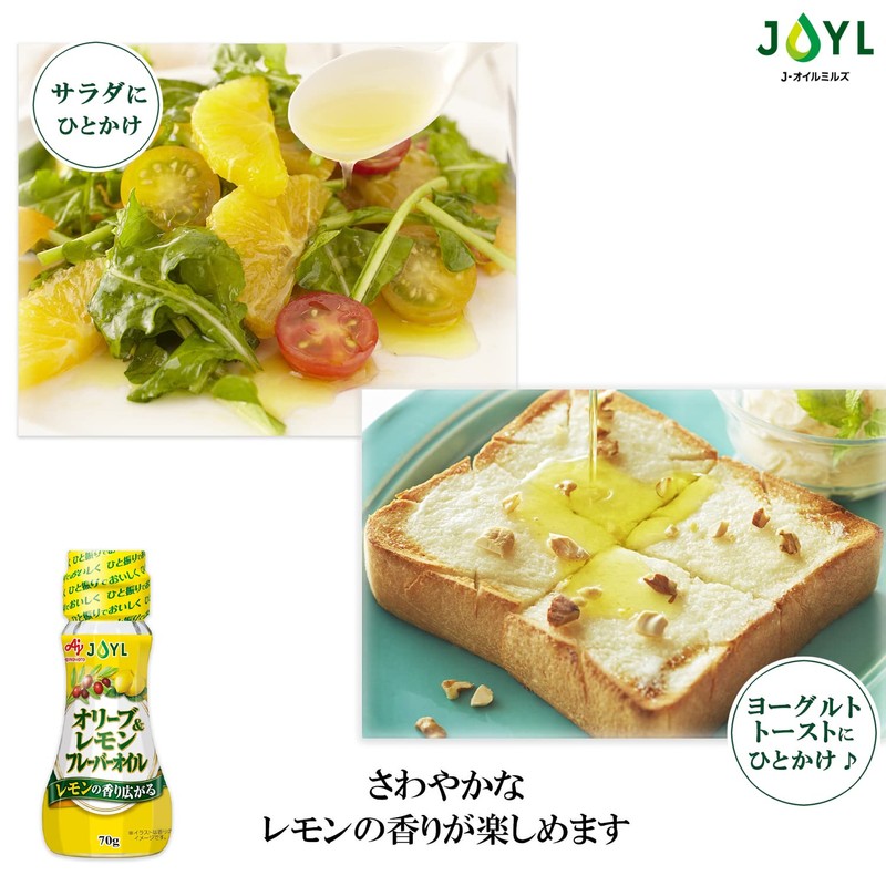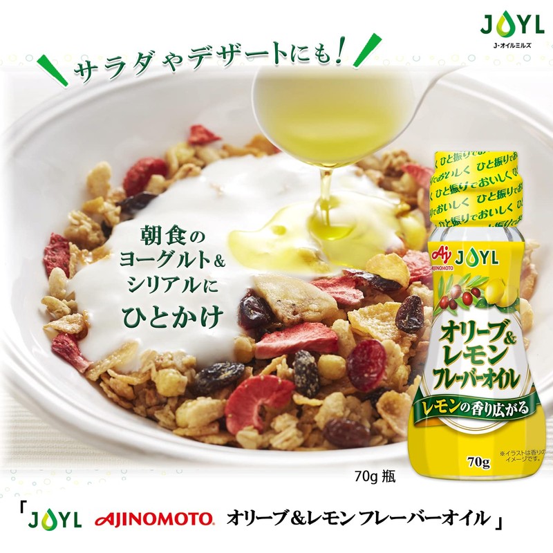 - 【商品紹介】「 JOYL ( Jオイル ) 味の素 オリーブ&レモン フレーバーオイル 」は、ひとかけするだけで口いっぱいに広がるレモンのフレッシュでさわやかな香りと、オリーブオイルのおいしさをお楽しみいただけます。ヨーグルトやサラダにかけて、またアイスにかけてもおいしくお召し上がりいただけます。「ひとかけ」するだけで、料理やデザートがさわやかにおいしく仕上がります。