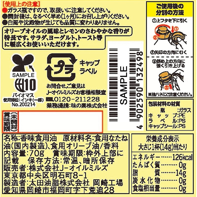- 【原材料】食用なたね油 (国内製造)、食用オリーブ油/香料【内容量】70g【商品サイズ(高さx幅x奥行)】119x53x53(mm) 【栄養成分】大さじ1杯(14g)当たり : エネルギー126kcal、たんぱく質 : 0g、脂質 : 14g、炭水化物 : 0g、食塩相当量 : 0g