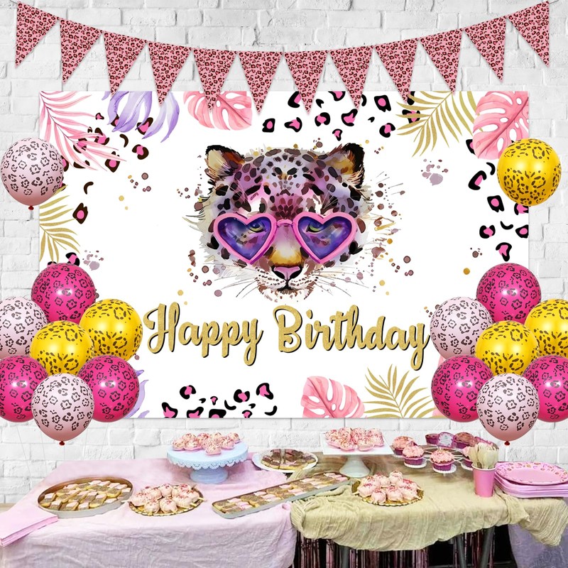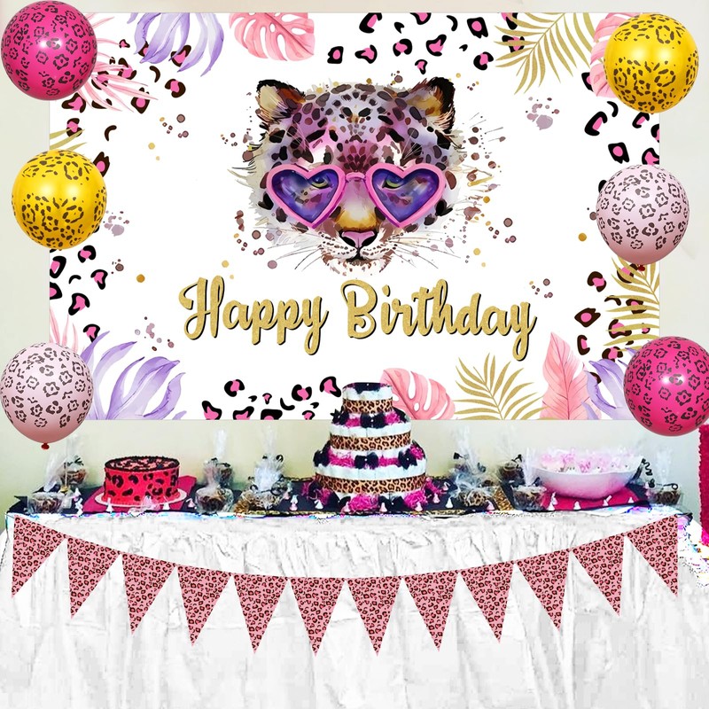 JOYMEMO Cheetah Birthday Decoration Girls - Including Leopard Print Pennant Banner Happy Birthday Backdrop Leopard Printed Balloons Set for Jungle Safari Animal Theme Party Supplies
