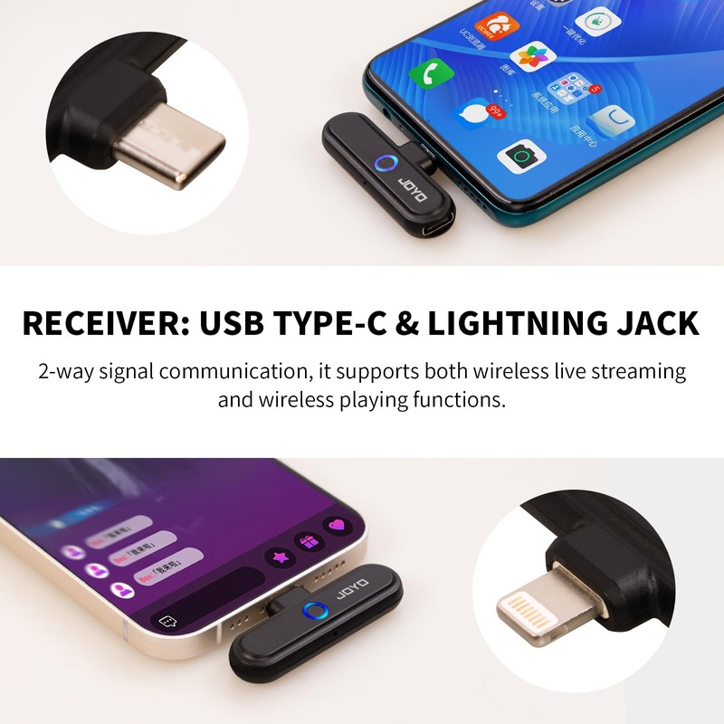 - Receiver: Type-C & Lightning interface for smartphone, plug & play. Built-in OTG audio interface function, it can supply power for smartphone by cables while charging.