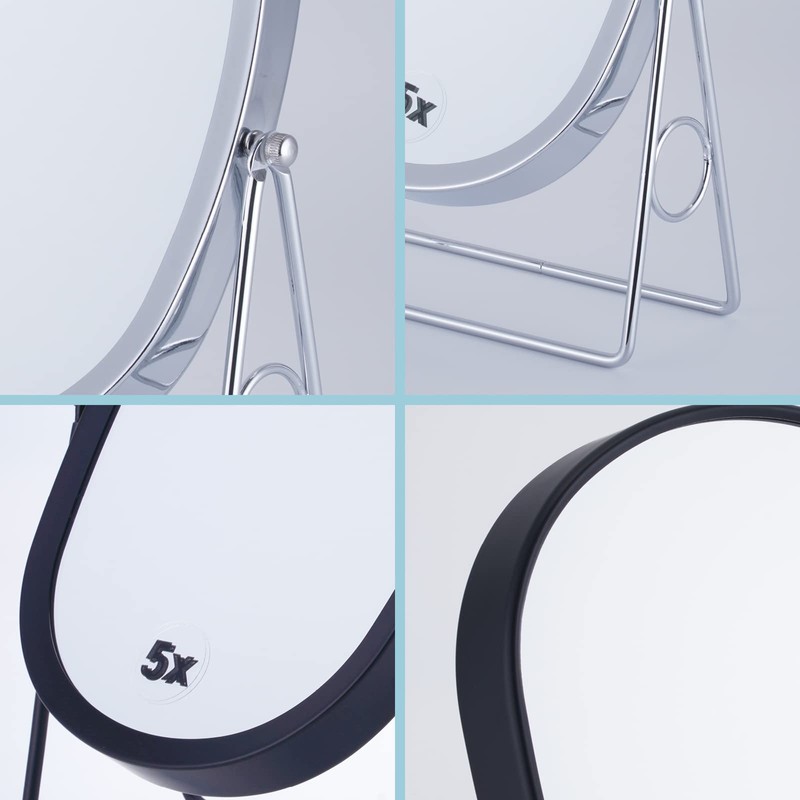 - Rotación de 360°: este espejo está diseñado con cabeza de espejo ovalada, y se puede girar 360°, mientras que el práctico lado de aumento 1X/5X proporciona una visión impecable de toda tu cara para las necesidades diarias, lo que puede permitirte maquillar, afeitar, usar lentes de contacto, pinzas de cejas y forma de cejas... etc.