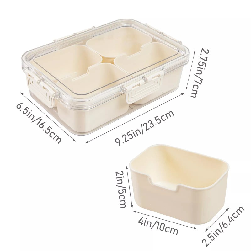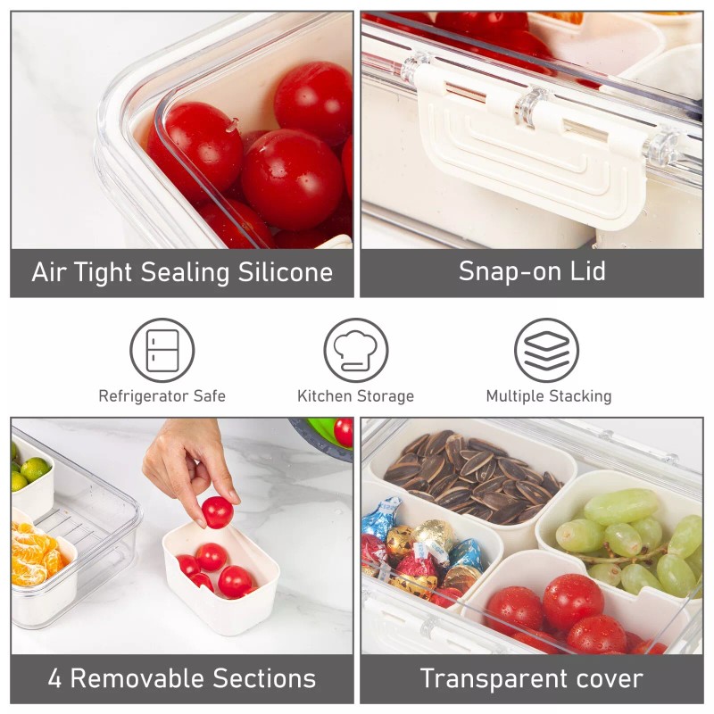 - Clear Organized and Multi-functional: The design of this Container allows you to easily view and access your snacks, keeping them fresh and neatly organized. The 4 divided compartments are customizable and removable, large enough to fit most storage needs