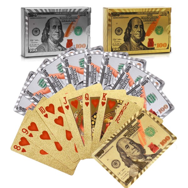 Joyoldelf 2 Decks of 24k Playing Cards, Waterproof Poker with Dollar Pattern in Gift Box, 1 Gold + 1 Silver