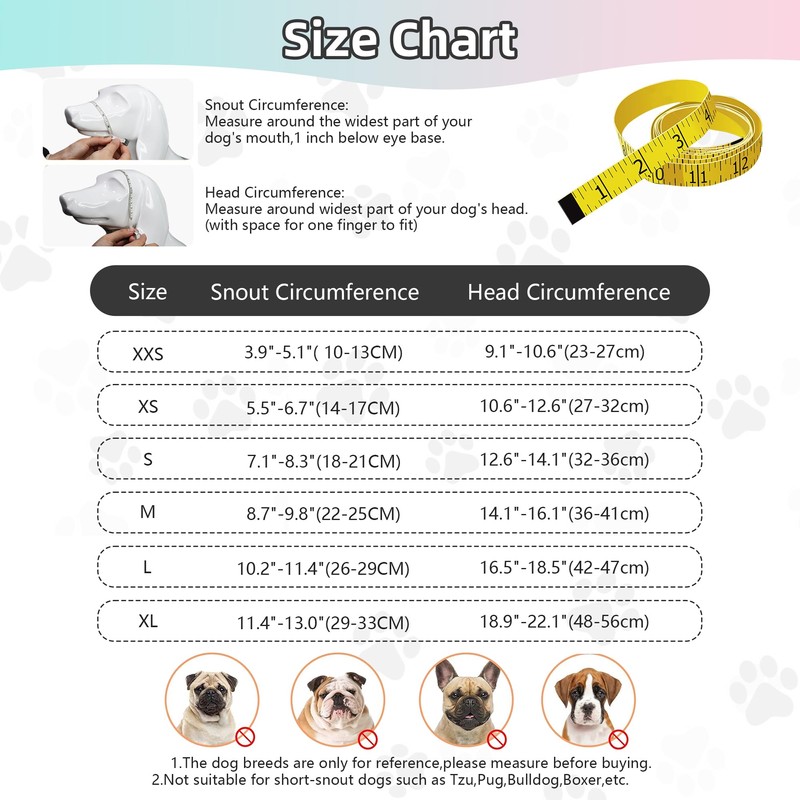 • Size: There are a total of 6 sizes XXS, XS, S, M, L, XL, suitable for small, medium, and large dogs. Please carefully read the size chart before purchasing to choose the appropriate size. In addition, the strap with a sliding buckle can be adjusted in size for better fixation, making the dog more comfortable to adapt to wearing the dog muzlle.