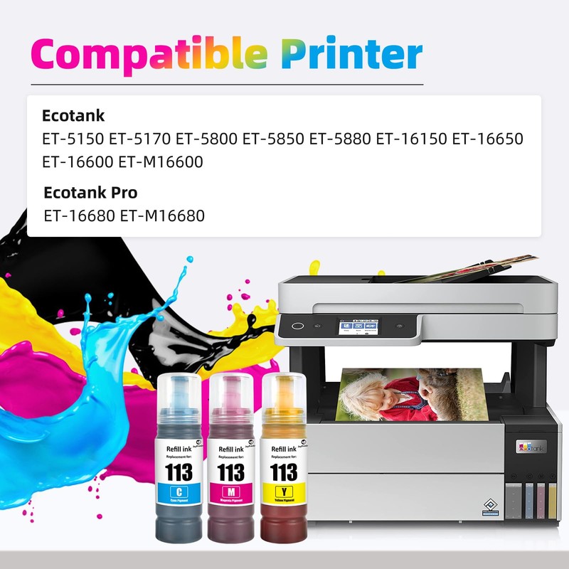 • 【What You Get】: JoyPrinting 113 Pigment Ink Bottle:(1 x 70ml 113 Cyan, 1 x 70ml 113 Magenta, 1 x 70ml 113 Yellow)(Total 3-Pack) TIPS: Please confirm your Printer Model to ensure that you purchase the correct ink bottle.