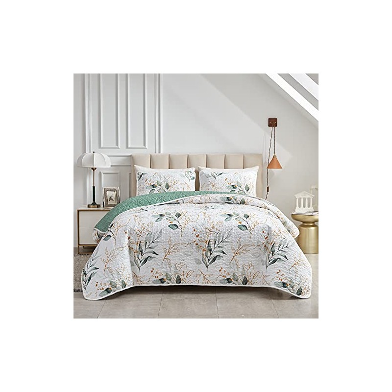 Joyreap 2 Pieces Microfiber Quilt Set, Botanical Green Leaves on White Reversible Design, Bedspread Bed Cover for All Season, 1 Quilt and 1 Pillow Sham (Twin, 68x86 inches)